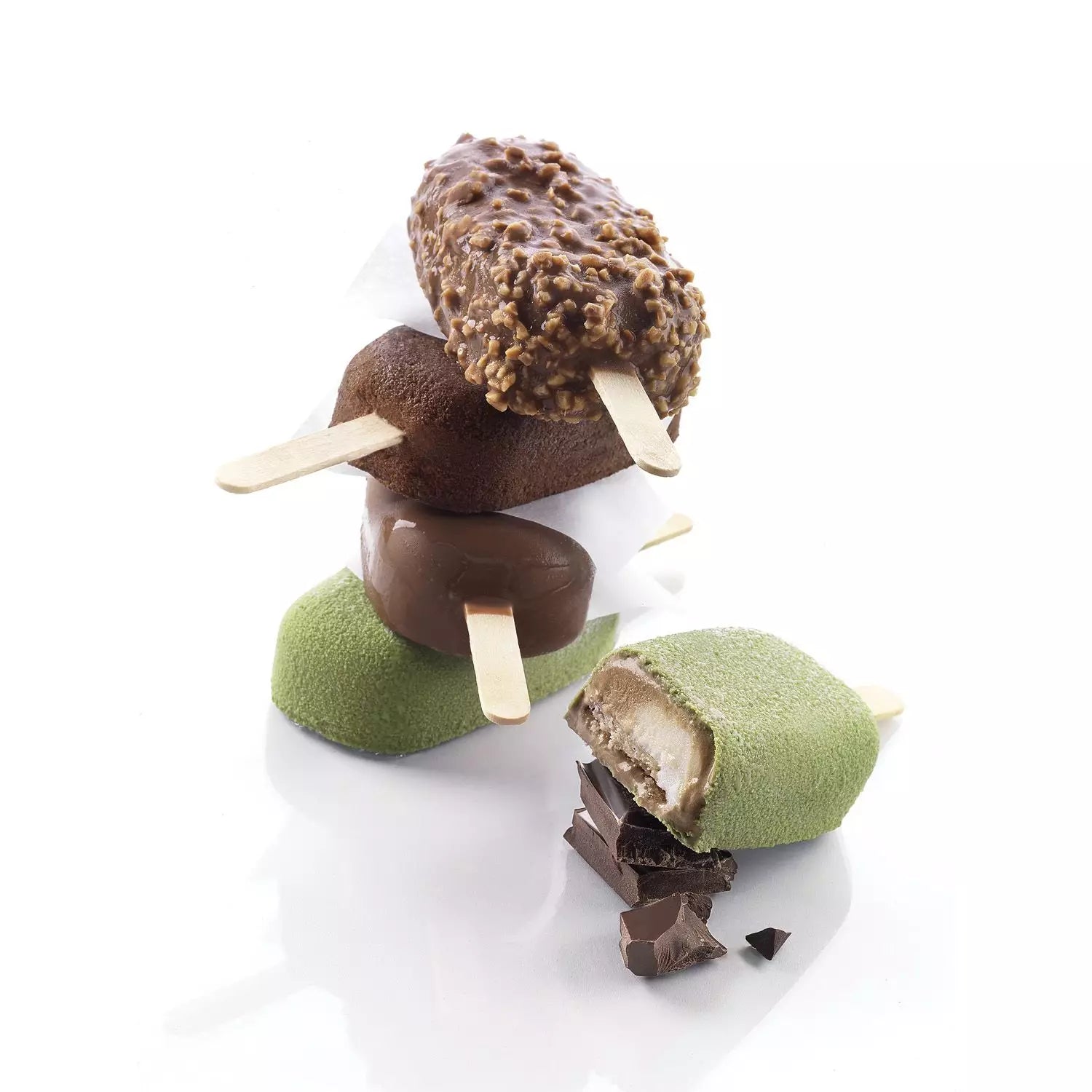 Kit per realizzare gelati su stecco, utilizzabile per preparazioni fredde e cotte. Il kit comprende 2 stampi in silicone, 50 bastoncini in legno e 1 vassoio 30x40 cm in policarbonato per il trasporto e lo stoccaggio. Volume singola forma: 90 ml. 48,5x93 h 25 mm